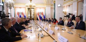 وصرح المتحدث الرسمي باسم رئاسة الجمهورية بأن الرئيسين عقدا جلسة مباحثات موسعة بحضور وفدي البلدين، استهلها الرئيس بوتين بالاعراب عن تقديره لمشاركة السيد الرئيس في الاحتفال هذا العام، مما يعكس العلاقات الراسخة والتاريخية التي تربط بين البلدين والشعبين الصديقين. من ناحيته، وجه السيد الرئيس التهنئة للرئيس الروسي والشعب الروسي بمناسبة عيد النصر، مشيدًا بعلاقات مصر الاستراتيجية مع روسيا، التي تستند إلى اتفاقية الشراكة الاستراتيجية الشاملة المبرمة بين البلدين عام ٢٠١٨، معرباً سيادته عن التقدير للزخم الذي تشهده العلاقات الثنائية بين البلدين في مختلف المجالات، بما في ذلك إنشاء المنطقة الصناعية الروسية في المنطقة الاقتصادية لقناة السويس، وإنشاء محطة الضبعة لتوليد الكهرباء بالطاقة النووية، واعرب الرئيسان عن تطلعهما الى نجاح اللجنة المشتركة بين البلدين خلال شهر مايو الجاري والتي سوف تتناول سبل تعزيز العلاقات الثنائية في كافة المجالات ذات الاهتمام المشترك.
