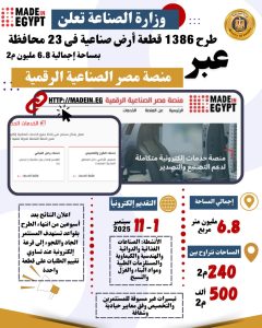 وزارة الصناعة تجدد دعوتها للمستثمرين الصناعيين الجادين للتقدم على الطرح الحادي عشر للأراضي الصناعية عبر “منصة مصر الصناعية الرقمية”