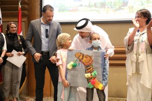 كما تسلّم درع التكريم ولوحة فنية من أعمال أطفال 57357، تعبيرًا عن امتنانهم وحبهم لدولة قطر وسعادته على دعمه الدائم لهم.